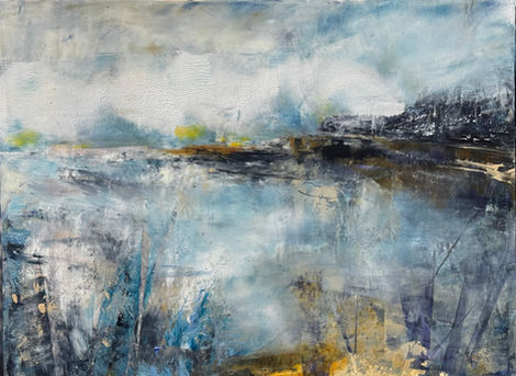Inspired by Downeast Maine and California coastlines, these winter landscapes translate observation into intuitive abstraction. Photographic references initiate the process, but the compositions evolve through gesture, surface excavation, and material response. Embedded throughout the paintings are upcycled, hand-made collage papers that introduce organic texture and variation, echoing land shaped by wind, water, and time. The interplay of luminous wax veils and expressive mark-making creates a sense of quiet movement across frozen terrain while preserving the stillness that defines winter environments.