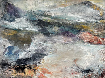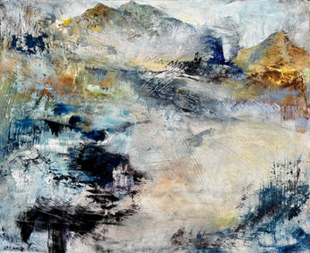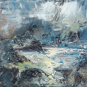 This series of semi-abstract landscapes captures rugged natural environments through a layered process that begins with an acrylic base and builds into rich surfaces of oil and cold wax. By working with a limited palette of calm blues, golden yellows, warm white, and burn sienna, the "bones" of the landscape are revealed. Coastal landscapes are effected by wind, rain, sun, and snow. With this series, I aim to capture the subtle and beautiful transitions from one season to the next. Exploring two rugged environments coastal downeast Maine and central California coastlines, I begin with photography by lean into intuition to arrive at the final, semi-abstract compositions.